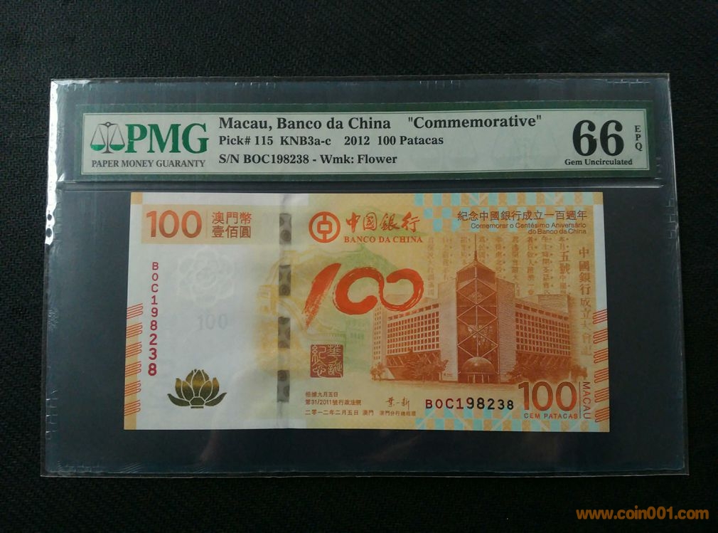 PMG66分---澳門荷花鈔 ---BOC198238(生日號(hào))---1850元