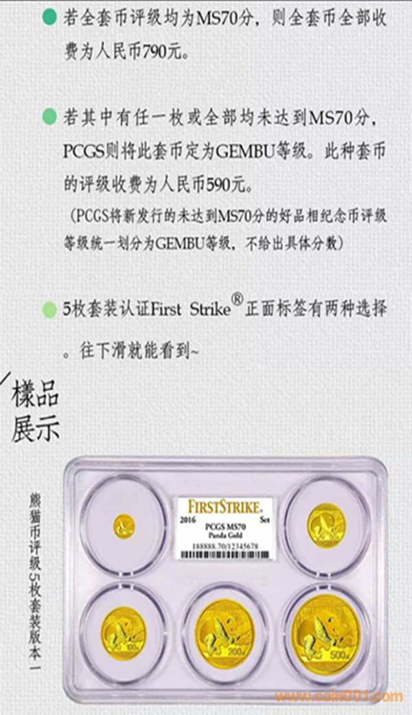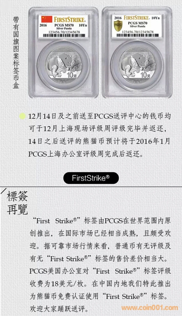 PCGS推出2016年熊貓金套裝幣及普通熊貓金銀幣(單枚/多枚)評級認證First Strike標簽。除正常評級費用外無需收取額外費用。