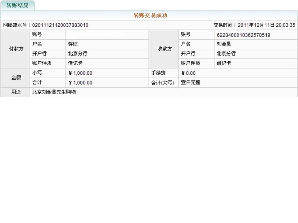 交易網(wǎng)點(diǎn): 工行甘肅省金昌業(yè)務(wù)處理中心 收款網(wǎng)點(diǎn): 工行北京分行業(yè)務(wù)處理中心