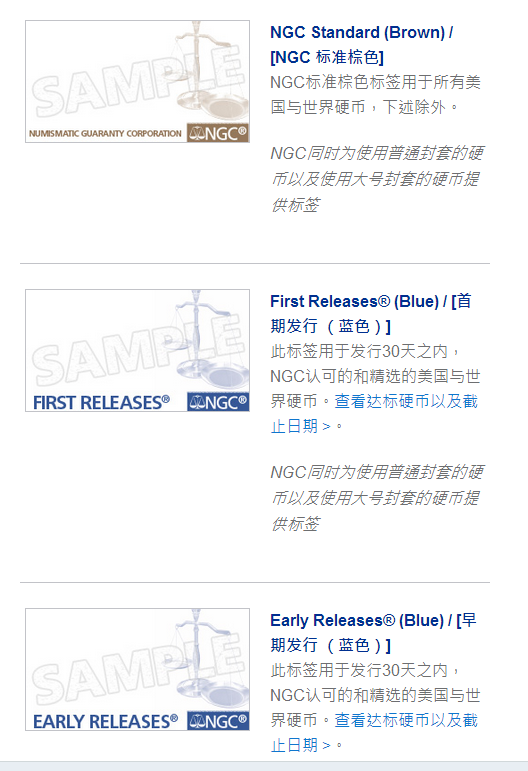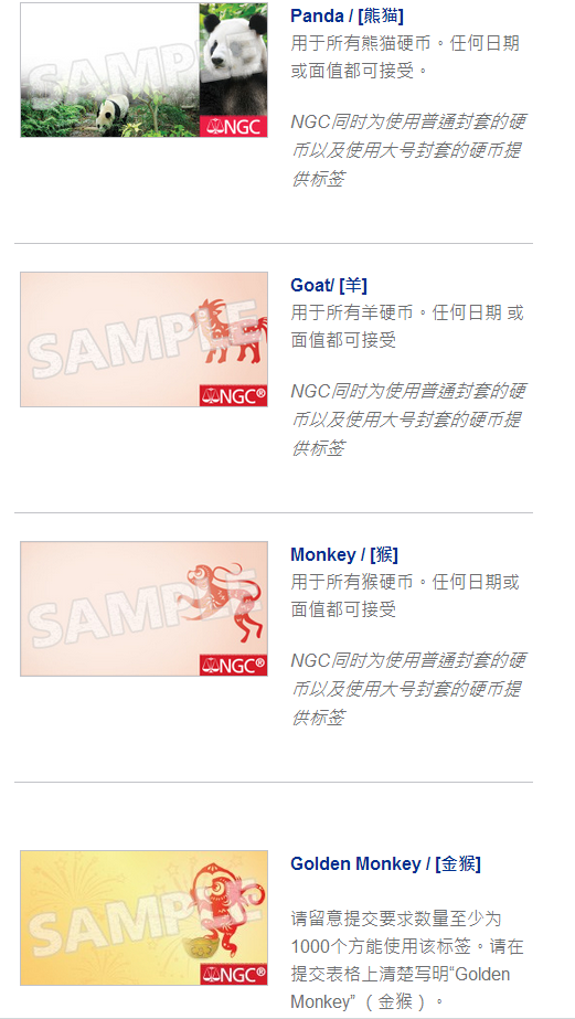 目前NGC官方定制發(fā)布的二猴標(biāo)有:首日標(biāo)七種 金藍(lán)色1st標(biāo)、猴標(biāo)、賀歲燈籠標(biāo)(馬到成功、年年有余、闔家安康、財(cái)源廣進(jìn)、萬(wàn)事勝意)
