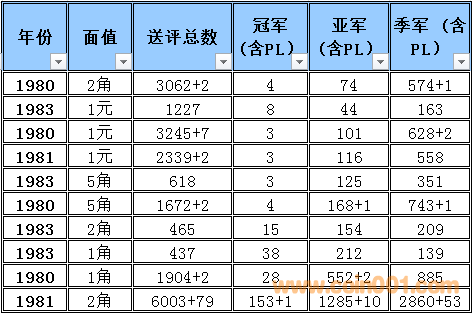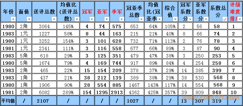 普制長城幣評級難度排序2016-1 (全新改版) 普制長城幣評級難度排序與早期分幣難度排序有明顯的區(qū)別,為了能體現(xiàn)難度系數(shù)的準(zhǔn)確性和科學(xué)性在計(jì)算時考慮的因素相對要復(fù)雜一些,主要參考了評級的總數(shù),均值比(送評總數(shù)),冠亞季軍總數(shù),均值比(冠亞季總數(shù))等數(shù)據(jù)作為計(jì)算的主要依據(jù),同時各個均值段的補(bǔ)償方法也比較復(fù)雜 首先我們需要討論評級幣的價格構(gòu)成 評級幣的價格構(gòu)成 裸幣的價格+評級溢價+評級費(fèi)用=評級幣的參考價格 主要可以參考以下2個因數(shù), 第一個因素為裸幣本生的價格(它的價格變動主要依據(jù)裸幣成交價格的變動而變動與評級溢價之間的關(guān)系不大) 舉例來說: 裸幣的價格上漲1倍評級難度系數(shù)沒有變化的話,評級幣的價格應(yīng)該相應(yīng)的上漲1倍+溢價+評級費(fèi)用=評級幣的參考價格,裸幣的價格的上漲只能帶動評級幣裸幣部分的上升,裸幣價格下跌,評級難度系數(shù)沒有變化的話,評級幣的價格為裸幣下跌的價格+溢價+評級費(fèi)用=評級幣的參考價格,裸幣的價格的下跌只能帶動評級幣裸幣部分的下跌 第二個因素為評級難度所產(chǎn)生的一個溢價 難度系數(shù)越高它對應(yīng)的溢價就越高。溢價變化主要依據(jù)評級難度系數(shù)與系數(shù)平均值的變化和對比來決定,溢價水平的上升在一定的程度上會提升高品質(zhì)裸幣的價格(卷光卷拆的硬幣)和品相的稀缺性,裸幣價格的下跌,如果評級難度提高的話評級幣的價格反而有可能會上升,從以上的結(jié)果可以得出下列結(jié)論,溢價是評級價格體系當(dāng)中最重要的組成部分,溢價和裸幣的價格體系完全是獨(dú)立的,之間的價格沒有直接的聯(lián)系 備注:關(guān)于這個數(shù)據(jù)的準(zhǔn)確性在設(shè)計(jì)這個表的時候我已經(jīng)考慮到了一個重評的可能性所以我只取冠,亞,季軍作為一個參考并同時設(shè)計(jì)了一個補(bǔ)償方案,重評從時間和金錢的角度來衡量的話不是非常經(jīng)濟(jì)且還存在一定的風(fēng)險,但是從長遠(yuǎn)看不能排除這個因數(shù)。雖然將來會產(chǎn)生一些誤差,但我認(rèn)為誤差不會太大尤其在高分段和稀缺性的錢幣,對于普制長城幣來說NGC已經(jīng)作為收藏的主流其數(shù)據(jù)的準(zhǔn)確性還是比較值得信賴的。 采樣的范圍 取樣范圍:1980-1985 普制長城幣 難度排序的選擇標(biāo)準(zhǔn):送評總數(shù)的平均值高于100%的普制長城幣,低于100%的數(shù)據(jù)將不體現(xiàn)在難度排序中 計(jì)算公式: 評級總數(shù)/均值=均值比 考慮到1983年長城幣存世量明顯低于其他年份的普制長城幣,1983年的數(shù)據(jù)將保留和計(jì)入到難度排序中,大家可以通過下面的圖表黃色部分發(fā)現(xiàn)被刪除的年份主要是送評溢價不高的年份,如果未來送評量穩(wěn)步上升的話,它將加入到采樣的范圍. 備:這個采樣的范圍會有一定的誤差,我將根據(jù)均值比的變化每個季度第一周進(jìn)行適當(dāng)?shù)恼{(diào)整,由于普制長城幣的版別比較復(fù)雜,無法進(jìn)行細(xì)分這里主要以年份為主,請大家諒解! 采樣的數(shù)據(jù)和計(jì)算的依據(jù) 統(tǒng)計(jì)第一檔次每個年份冠,亞,季的出分?jǐn)?shù)量作為一個分析依據(jù),為了能更加的量化我用數(shù)字的方法進(jìn)行統(tǒng)計(jì),方法如下: 調(diào)整后的均值比 普制長城幣的計(jì)算方法如下: 綜合值的計(jì)算方法: (送評總數(shù)均值比+冠亞季總數(shù)均值比)÷2=綜合值 具體計(jì)算方法如下: 均值比在0-50% 冠軍分1枚為1分2枚2分以此類推,亞軍分1枚為2分2枚4分以此類推,季軍1枚為3分2枚6分以此類推 補(bǔ)償方法如下: 如果冠軍分的評分?jǐn)?shù)量大于總數(shù)(冠,亞,季之和)的15%,冠軍分的1枚為1.5分,如果冠軍分的評分?jǐn)?shù)量大于總數(shù)(冠,亞,季之和)的50%冠軍分的1枚為2分 如果亞軍分的評分?jǐn)?shù)量大于總數(shù)(冠,亞,季之和)的35%,亞軍分的1枚為2.5分,如果亞軍分的評分?jǐn)?shù)量低于總數(shù)(冠,亞,季之和)的25%亞軍分的1枚為1.5分 均值比在50-100% 冠軍分1枚為1分2枚2分以此類推,亞軍分1枚為1.5分2枚3分以此類推,季軍1枚為2分2枚4分以此類推 此范圍+值補(bǔ)償 如果冠軍分的評分?jǐn)?shù)量大于總數(shù)(冠,亞,季之和)的50%冠軍分的1枚為1.25分 如果亞軍分的評分?jǐn)?shù)量大于總數(shù)(冠,亞,季之和)的35%,亞軍分的1枚為1.75分 均值比在100-150% 冠軍分1枚為0.5分2枚1分以此類推,亞軍分1枚為1分2枚2分以此類推,季軍1枚為1.5分2枚3分以此類推 補(bǔ)償方法如下: 如果冠軍分的評分?jǐn)?shù)量大于總數(shù)(冠,亞,季之和)的15%,冠軍分的1枚為0.75分,如果冠軍分的評分?jǐn)?shù)量大于總數(shù)(冠,亞,季之和)的50%冠軍分的1枚為1分 如果亞軍分的評分?jǐn)?shù)量大于總數(shù)(冠,亞,季之和)的35%,亞軍分的1枚為1.25分,如果亞軍分的評分?jǐn)?shù)量低于總數(shù)(冠,亞,季之和)的25%亞軍分的1枚為0.75分 均值比在150%-180% 冠軍分1枚為0.5分2枚1分以此類推,亞軍分1枚為0.75分2枚1.5分以此類推,季軍1枚為1.25分2枚2.5分以此類推 如果冠軍分的評分?jǐn)?shù)量大于總數(shù)(冠,亞,季之和)的15%,冠軍分的1枚為0.62分,如果冠軍分的評分?jǐn)?shù)量大于總數(shù)(冠,亞,季之和)的50%冠軍分的