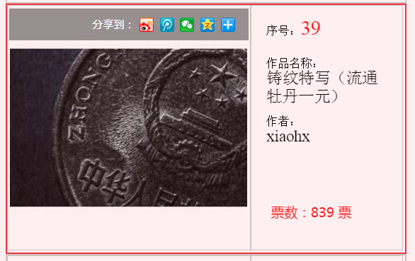 22號作品《頤和園長廊》(創(chuàng)意類三等獎)賞析:我雖然沒見過這枚大銅章(從圖上看像銅質(zhì)),但這幅微距圖片給人很強的視覺沖出力、很強的透視感,將長廊的縱深拍攝出來了,突出了“長”,廊柱及地面質(zhì)感也不錯。當(dāng)我第一眼看到這幅長廊圖的時候就在想,這就是當(dāng)年慈禧太后走過的長廊嗎?這就是作品的成功之處!