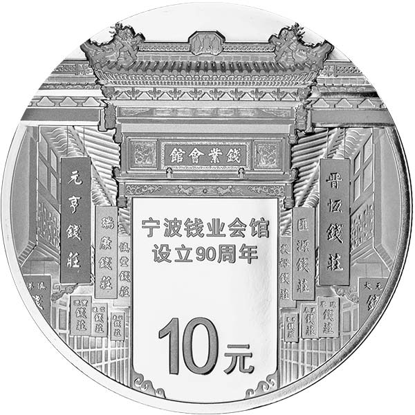 30克圓形銀質(zhì)紀念幣背面圖案為寧波錢業(yè)會館大門建筑局部造型,配以會館內(nèi)景組合設(shè)計,并刊“寧波錢業(yè)會館設(shè)立90周年”字樣及面額。
