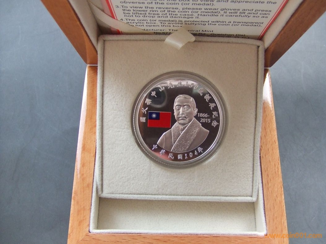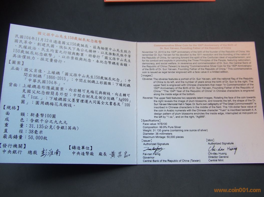 紀念銀幣面額為新臺幣100元,含銀1英兩,硬幣正面刻有國父肖像及彩色青天白日滿地紅國旗,背面上緣則有扇形隱藏圖案,輕微轉動可見國花梅花及梅枝,以及國父紀念館外型,下緣則以雷射雕刻國父墨寶「禮嘰笸谷?。央行發(fā)行局局長施遵驊說:『(原音)我們做了一些最先進技術的結合,第一點,我們把國旗青天白日滿地紅是彩色的做在銀幣上,同時背後有扇形隱藏圖案,還有雷射雕刻國父的墨寶