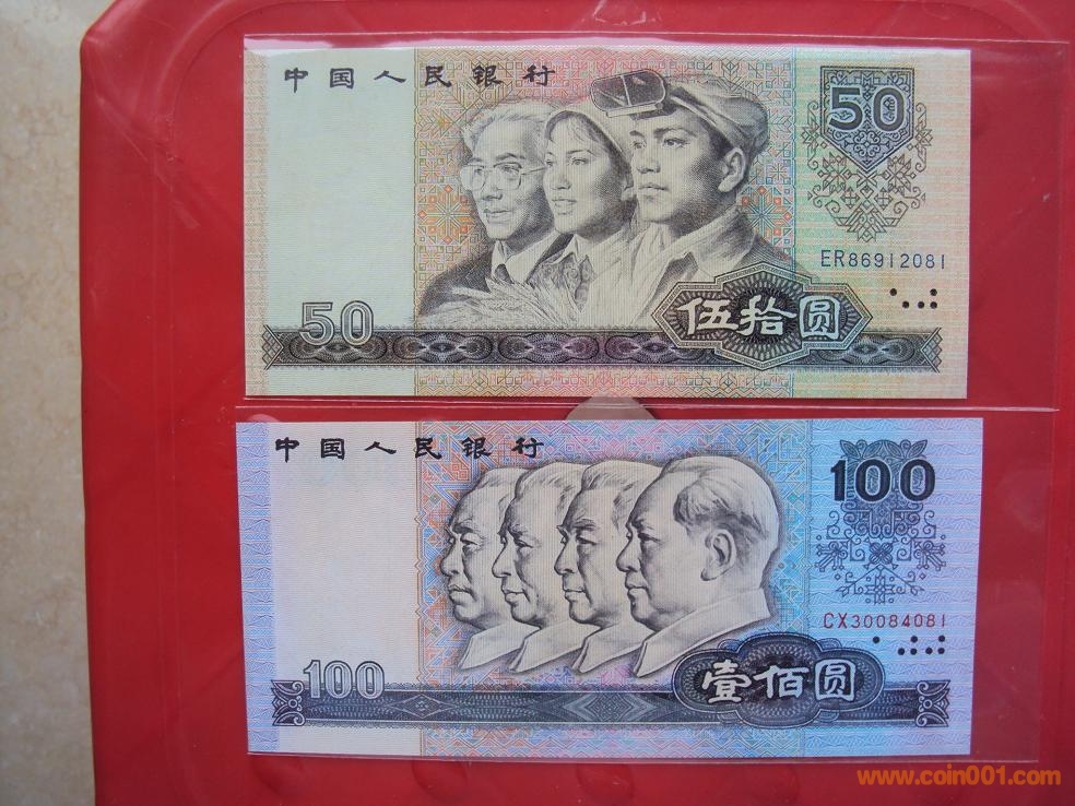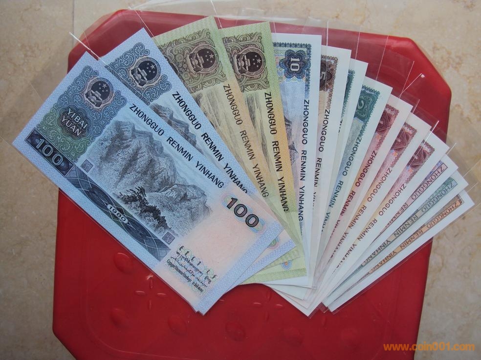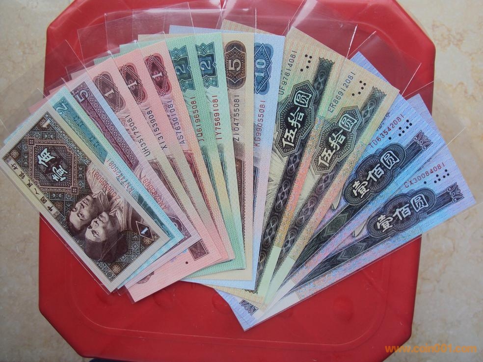 1)80版+90版100元劵各一枚;(2)80版+90版50元劵各一枚;80版50元(第四人民幣鈔王,罕見)(3)80版10元劵一枚;(4)80版5元劵一枚;(5)80版+90版2元劵各一枚;(6)80版+90版+96版1元劵各一枚;(7)80版五角劵一枚;(8)80版兩角劵一枚;(9)80版一角劵一枚;(10)紙分幣三張.最大特點:中國人民銀行發(fā)行的第四套人民幣全套九種劵別“末三位”數(shù)字編號全部相同