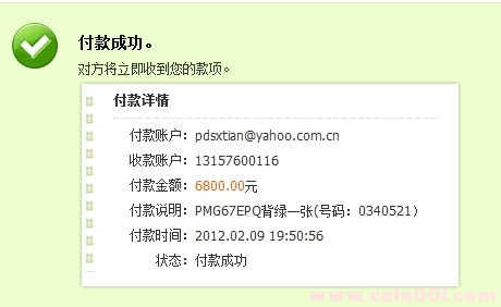 引用 引用第10樓goldcn于2012-02-09 19:53發(fā)表的 : 已經(jīng)轉(zhuǎn)款成功 請查收 有短信提醒。 貨發(fā)我簽名檔地址 .......