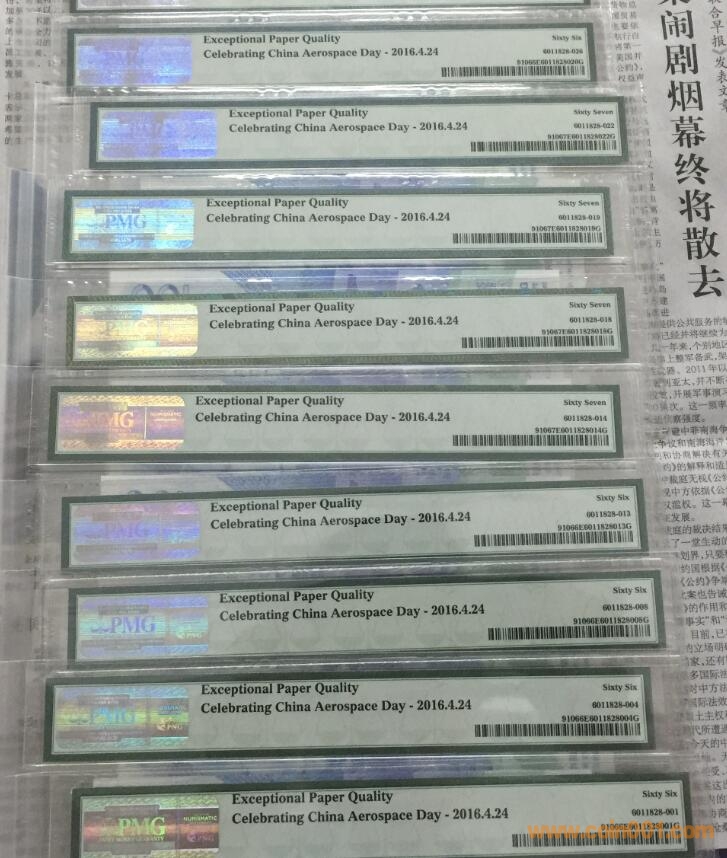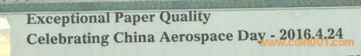 為了紀念首屆中國航天日,NGC和PMG將為2015年中國航天幣和航天鈔提供特殊標示。這個標示在標簽上將會被列為“Celebrating China Aerospace Day - 2016.4.24”(慶祝中國航天日--2016.4.24)。它可適用于2016年4月24日或者之前接收的2015年的10元面值航天幣和100元面值航天鈔。