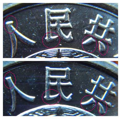 ??????經(jīng)仔細(xì)對(duì)比和甄別每個(gè)年號(hào)硬分幣的大量實(shí)物樣本,包括公開(kāi)發(fā)行進(jìn)入流通的硬分幣,和不公開(kāi)發(fā)行未進(jìn)入流通的套裝硬幣,發(fā)現(xiàn)硬分幣共有三種類型的版別。為了更全面地表述這些版別的特征,筆者現(xiàn)把硬分幣劃分為“平版”、“凸版”、“混合版”三種版別。