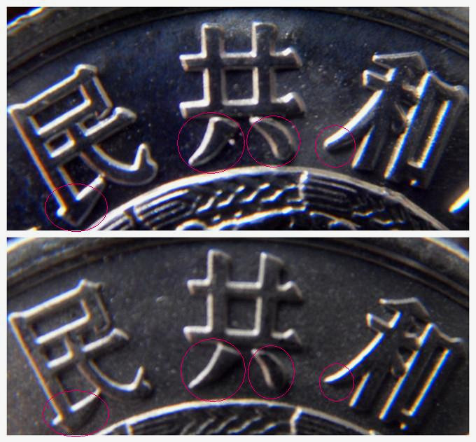 ??????????在這類分幣中,需要特別提及的是,由于56-5分有早期50年代鑄造和后期60、70年代鑄造的,56-5分進(jìn)一步可以劃分為小星版即原版和大星版即新版的子版別分類(見(jiàn)圖6、7、8對(duì)比圖),前者屬于常態(tài),后者屬于特殊版別,主要區(qū)是,五角星大小及間距有肉眼可見(jiàn)明顯區(qū)別,“共”、“和”等字字體有明顯區(qū)別,字體粗細(xì)也有差異,56-5是圖文的顯著區(qū)別因此屬于不同版別。