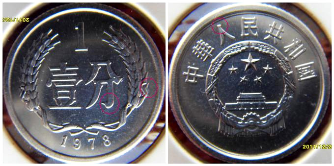 (圖9:78-1混合版) ??????第三種版別稱之為“混合版”(平芒拐角勾人字頭平頭或有頓筆,見(jiàn)圖7、8對(duì)比圖):是過(guò)渡時(shí)期鑄造的最少見(jiàn)的版別,目前只發(fā)現(xiàn)72-1和78-1具有此特征,即混合了“平版”和“凸版”的特征,主要特征是:麥芒和飄帶是平行的,而分字的勾是凸起的拐角勾。其它細(xì)微區(qū)別也不再贅述。這種罕見(jiàn)版別可用“混合版”概括其特征。
