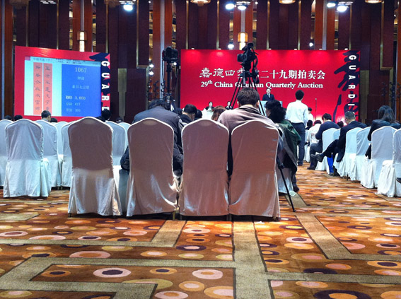 2012嘉德四季第29期拍賣會-明清古典家具和書畫的專場拍賣,這兩個拍賣在兩個廳同時舉槌。明清古典家具的拍賣現(xiàn)場坐無缺席,還有在后面加椅子或者站著的,而書畫的拍賣現(xiàn)場有很多空位。參加家具的拍賣人氣遠遠大于書畫的拍賣。