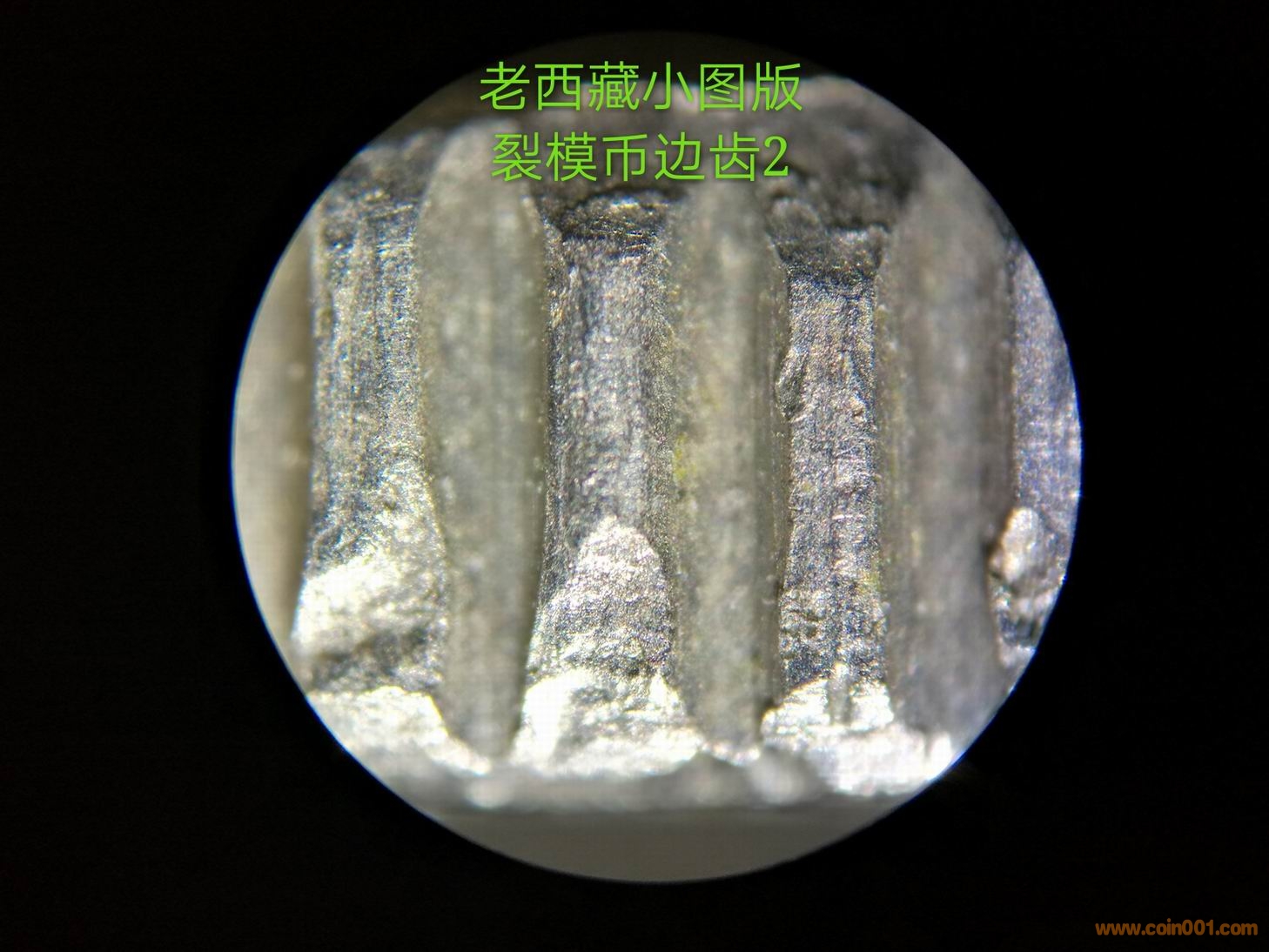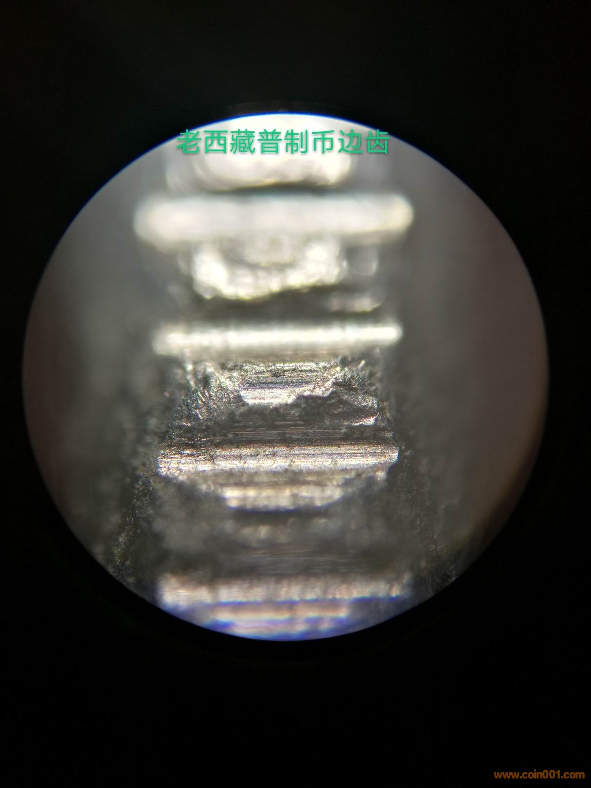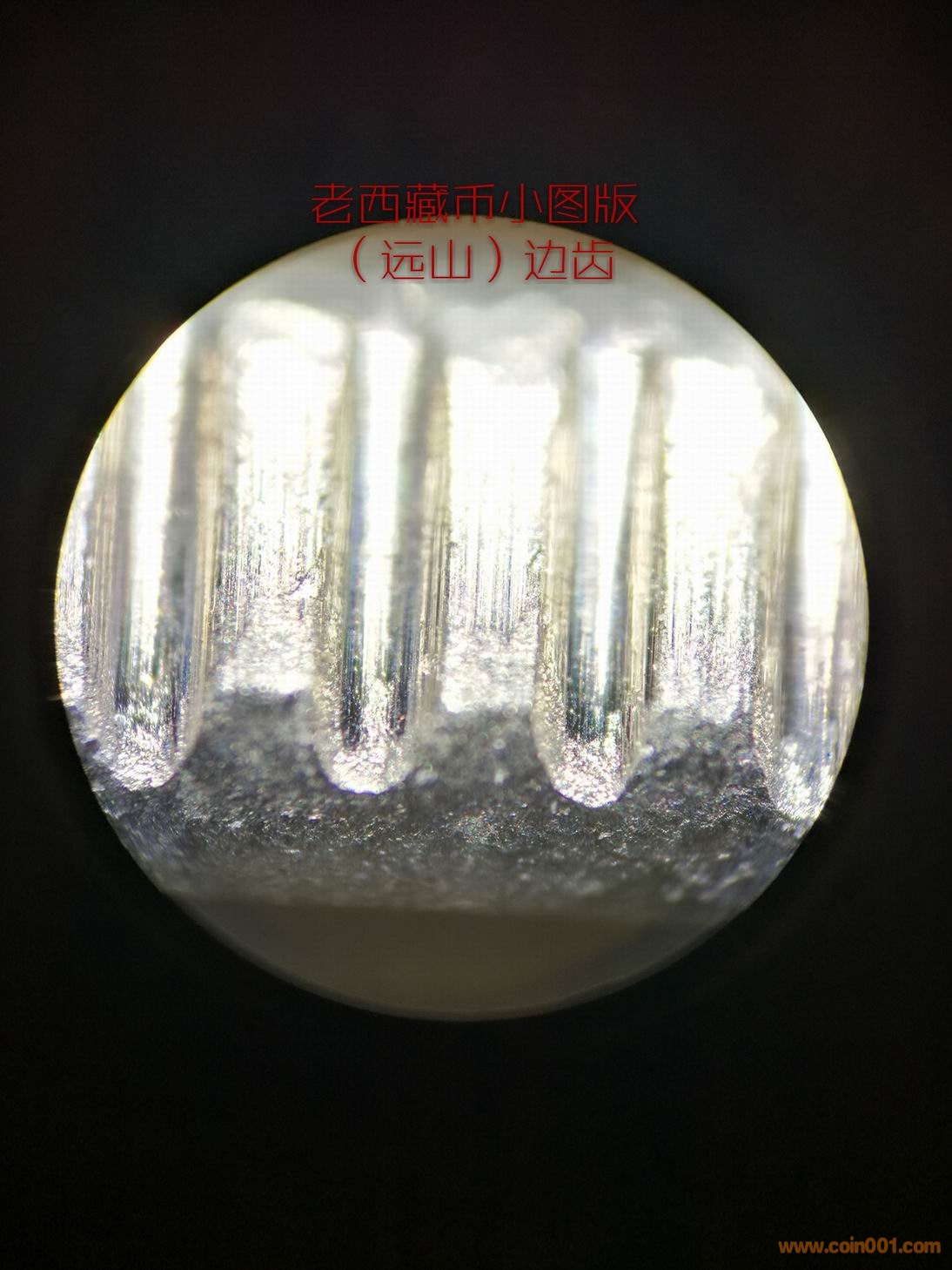 造幣廠在試機(jī)壓幣的時(shí)候,臨時(shí)調(diào)配模圈(或是舊模),很正常。但從小圖版原光幣邊齒的拍攝圖片看(圖9、圖10),所使用的模圈應(yīng)該是新模圈。