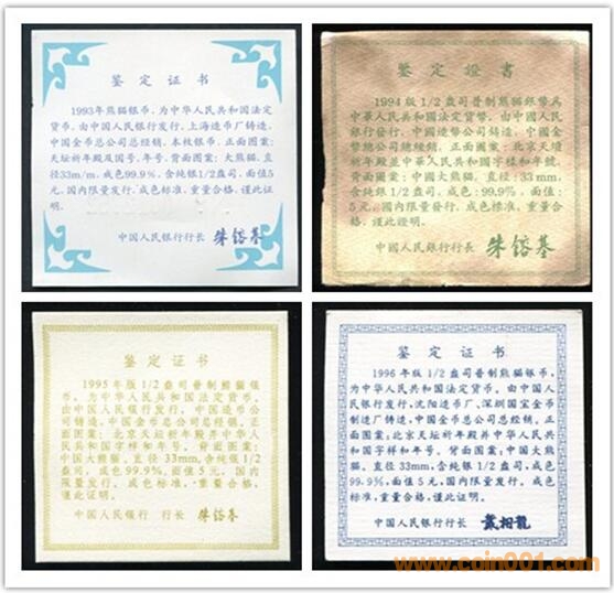 1993年裝幀套幣試驗(yàn)的失敗,金總決定不再推出1994年大熊貓銀銅套裝,直到1995年,郵幣卡市場行情轉(zhuǎn)暖,金總才小心翼翼地裝幀了5000套試銷,這5000套的證書,與1993年的證書系同一版本,只是略去了英文,聯(lián)系到1995年因?yàn)榕_(tái)海危機(jī)導(dǎo)致中國與最大的貿(mào)易伙伴國美國關(guān)系全面緊張,1995年的熊貓銀銅幣套裝縮量裝幀不標(biāo)注英文合乎情理。1996年,郵幣卡市場行情全面啟動(dòng),金總清點(diǎn)庫房,發(fā)現(xiàn)庫房里還有大量的1993年1/2盎司熊貓銀幣,于是決定,將庫存的1993年版熊貓銀銅幣全部裝幀,在各門市部上柜出售。兩次裝幀的總量之和,應(yīng)該是100000套。金總決定擴(kuò)大裝幀量后,因?yàn)樾碌淖C書來不及印制,便把原先的證書上的“10,000”之后添一個(gè)“0”臨時(shí)過渡。湊合用了一陣后,可能金總覺得這樣不夠嚴(yán)肅,也不便于管理,于是要求各門市部將原有的證書統(tǒng)一收回,按照原先編號(hào)換發(fā)新的證書,于是世面上就出現(xiàn)了手工添加“0”的老證和重新印制加“0”的新證。需要說明的是,新證上的“10,0000”也是不符合規(guī)范的,正確的寫法應(yīng)該是“100,000”。