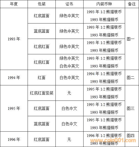 90年代開始,流通紀(jì)念幣和金銀幣的發(fā)行和裝幀已趨規(guī)范。而從1993年到1996年短短四年間,大熊貓銀銅紀(jì)念幣套裝竟然出現(xiàn)了9種裝幀,著實(shí)令人費(fèi)解。