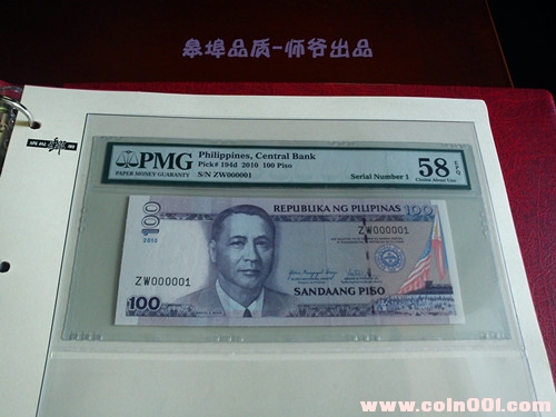 一枚58分的菲律賓100比索,號碼000001,是咱木耳大哥那拍到的。我自己還有一枚888888的100比索,今天剛送去評級,不知道有多少分哈。