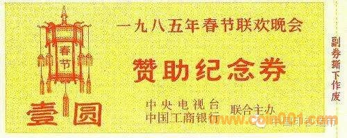 1985年,是央視創(chuàng)新直播春晚的第三個(gè)年頭,老百姓以極大的熱情歡迎和接受了“春晚”的出現(xiàn)。由于經(jīng)費(fèi)不足,央視與中國(guó)工商銀行聯(lián)合主辦春晚,利用工商銀行的網(wǎng)點(diǎn),面向全國(guó)的大、中城市發(fā)行面額為“壹圓”的“1985年春節(jié)聯(lián)歡晚會(huì)贊助紀(jì)念券”,募集50萬元的晚會(huì)贊助資金,其實(shí)質(zhì)等同于cai票,春晚贊助紀(jì)念券的發(fā)行,是中央電視臺(tái)僅此一次為舉辦春晚,面向全國(guó)籌集經(jīng)費(fèi)。并在2月19日春晚進(jìn)行現(xiàn)場(chǎng)公證搖獎(jiǎng),中獎(jiǎng)的觀眾憑券到當(dāng)?shù)毓ど蹄y行領(lǐng)獎(jiǎng)。