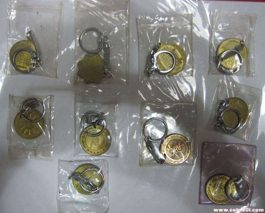 之前有人猜想帶“F”的可能是上幣廠分廠生產(chǎn)的,“F”代表是分廠的“分”字的拼音。但是我有一版上幣一輪88年龍的30mm的鑰匙圈,整版的少見。我發(fā)現(xiàn)在整版的鑰匙圈中,既有帶“F”的,又有不帶“F”的,見圖14-2 。這樣基本可以判斷,無論帶不帶“F”的都是一個地方生產(chǎn)的,帶“F”的不可能是某一個廠專門生產(chǎn)的。至于為什么會在開模具的時候,制造出帶“F”和不帶“F”兩種版別,目前還是一個迷,有待進一步的研究。