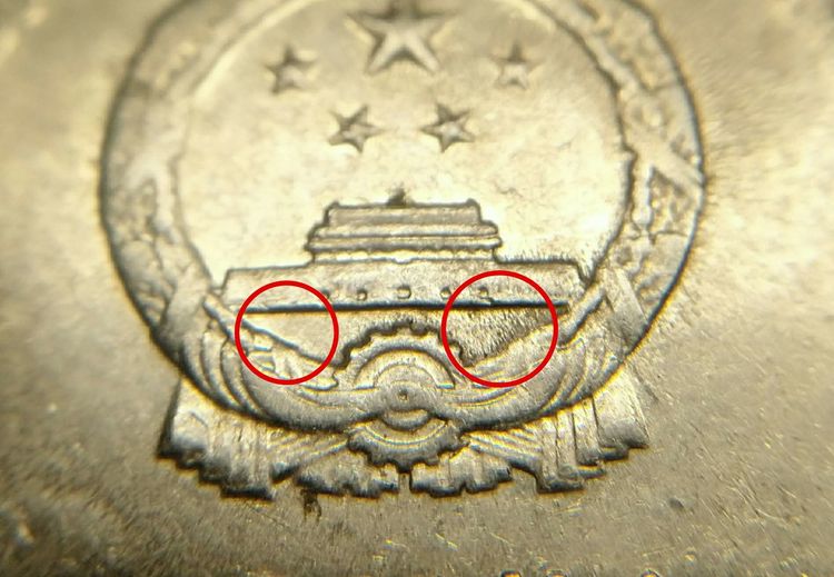 樓主最好用圖片來(lái)說(shuō)明“保留鏡面”是怎么個(gè)樣子。這里和樓主的主張有沖突。既然透打(幣模凹陷)是在幣模長(zhǎng)期使用以后才出現(xiàn)的,就不會(huì)再有鏡面了吧?普制幣上的鏡面只能在初鑄幣上見(jiàn)到。下圖中顯示了角幣正對(duì)國(guó)徽的部位??梢钥吹酵钩鰩琶娴倪?,但是當(dāng)中部分見(jiàn)不到鏡面。雖然這部分的狀態(tài)比幣邊附近要好,沒(méi)有那樣多鑄紋,但是鑄紋都是周?chē)犬?dāng)中要密集。