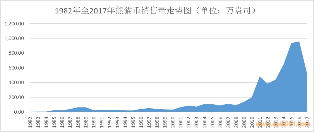 市場重心:早期我國的熊貓幣主要在境外發(fā)售,1984年8月31日國內居民開始可以使用人民幣購買,同時國內的銷售規(guī)模開始逐步擴大。按2017年度銷售總金額計算,熊貓幣的市場份額已有百分之九十多是在國內實現(xiàn),熊貓幣的市場銷售重心已經發(fā)生重大變化。