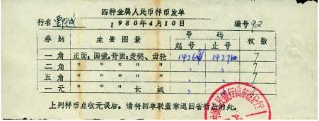 在2010年5月下半月《錢幣報(bào)》刊登的一篇由孫克勤老師、陳志宏老師合寫的文章(題目:1980版長(zhǎng)城樣幣)中,提及了陳志宏老師發(fā)現(xiàn)《四種金屬人民幣樣幣發(fā)單》,發(fā)單記載的內(nèi)容為:【行名鄄城,1980年4月10日,編號(hào)92,樣幣號(hào)碼原來(lái)是14364-14370,后涂改為14365-14371,上列樣幣點(diǎn)收無(wú)誤后,請(qǐng)將回單聯(lián)蓋章退回省行出納處等字樣和“中國(guó)人民銀行山東省分行”的騎縫印章】。
