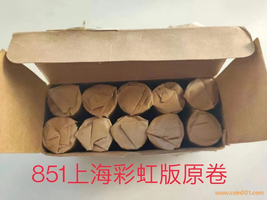 851長城幣有三種不同包裝形式:1.油蠟紙人工卷(含彩虹、日出,少磚)出自上海造幣廠,原盒封簽日期基本是85年下半年最后幾個月份,是851最先生產(chǎn),最先流通,發(fā)行數(shù)量最少的版本,卷幣采用油蠟紙手工卷包裝,造幣廠采用蠟紙手卷,一般是工藝較好的初打幣,851彩虹版的材質(zhì)以及工藝與同期生產(chǎn)的新疆紀念幣非常相近(可能采用同一條生產(chǎn)線),有可能851彩虹版幣胚銅鎳合金配比與新疆相同(b25),這樣可以共用相同的卷材條片,新疆的包裝也是油蠟紙手工卷,所以本人猜測851彩虹生產(chǎn)的量應(yīng)該與新疆紀念幣(450w)相差不遠。 這里我認為只有油蠟紙卷的上海851才能稱為彩虹版,下面介紹的牛皮紙機卷的只能叫做上海普通窄版。
