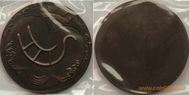 1991年上幣制造,紫銅鍍金普制、紫銅鍍銀普制、紫銅上色。三種版別均為50MM。