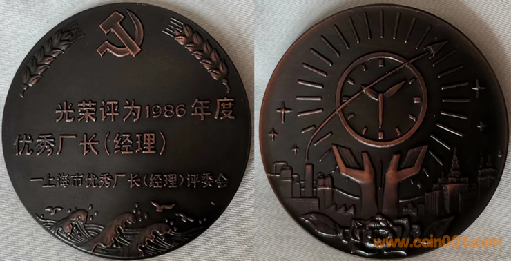 1991年上幣制造,紫銅上色60MM。正面“浙江精品獎”文字,反面為主題文字。