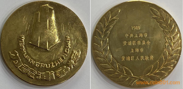 1989年上幣制造,紫銅鍍金普制60MM。正面“為黃埔爭輝”文字,反面“1989”年號及主題文字。