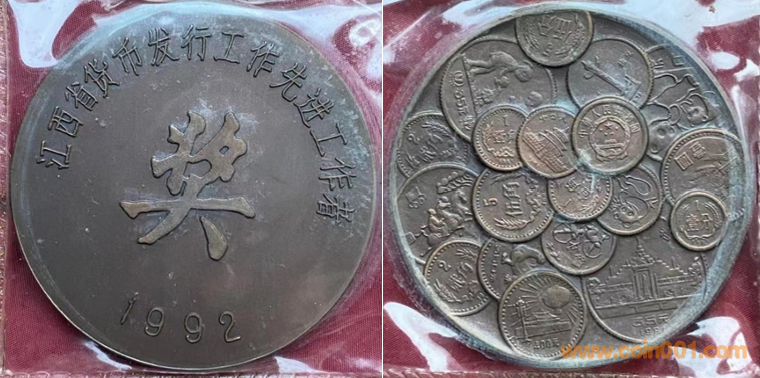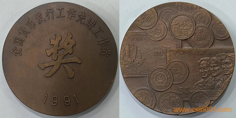24. 全國貨幣發(fā)行先進(jìn)工作者獎?wù)?br />1991年上幣制造,紫銅上色60MM。正面為主題文字,反面為“章中疊幣”圖案。