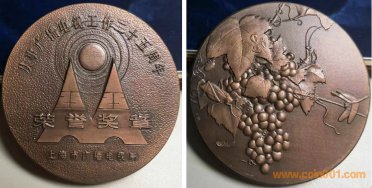 21. 從事廣播電視工作二十五周年榮譽(yù)獎?wù)?br />1991年上幣制造,紫銅上色60MM。正面為主題文字,反面為葡萄蟲草。