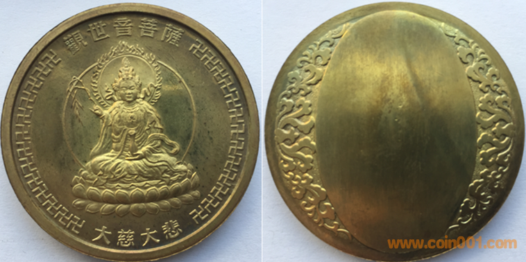 80年代上幣制造,黃銅普制。正面為觀音菩薩,反面為花紋圖案。