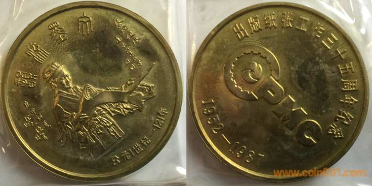1987年上幣制造,黃銅精制。正面為蔡倫,反面為主題文字。此章后期疑似有仿品。