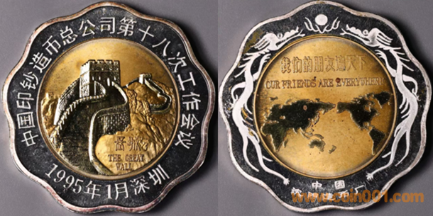 1990年上幣制造,紫銅上色。正面為國際造幣會議會徽,反面為熊貓疊幣圖案。