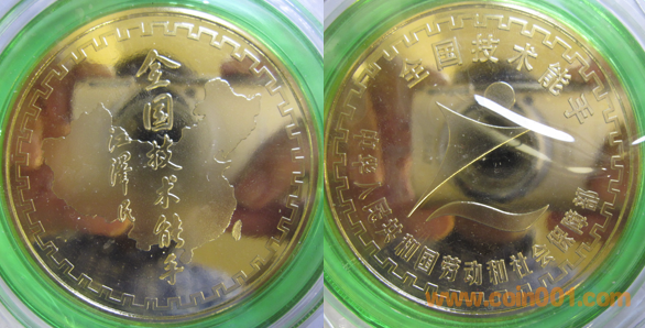 1986年上幣制造,紫銅上色。正面為金杯獎獎杯,反面為熊貓疊幣圖案。此章后期疑似有仿品。