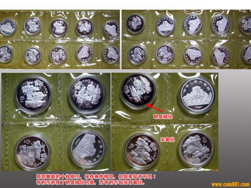 周衛(wèi)榮說,銀幣腐蝕,原因比較清楚,因?yàn)榘足y本身就易受腐蝕,因此,我們只是用上述方法做了簡單的分析,檢測結(jié)果:褐色銹蝕物為銀的氧化物和硫化物;白斑為氯化銀。氧化銀、硫化銀,主要由空氣中的腐蝕性物質(zhì)反應(yīng)生成;氯化銀主要由包裝材料分解物腐蝕生成。另外,電化學(xué)腐蝕發(fā)生時會與空氣中的顆粒物質(zhì)形成多種化合物,因而表面往往呈現(xiàn)多種色彩。這些也從金銀幣的儲藏環(huán)境即包括包裝材料和周圍環(huán)境氛圍(空氣)的檢測中得到了印證。在對金銀幣的內(nèi)外包裝材料檢測時,發(fā)現(xiàn)現(xiàn)行金銀幣的貼身包裝(軟硬兩種)為聚氯乙烯材料制成,而聚氯乙烯具有腐蝕性;現(xiàn)代都市,隨著工業(yè)化程度的提高和汽車擁有量的與日俱增,空氣污染也比較嚴(yán)重,環(huán)境空氣中較高濃度的有害氣體(腐蝕性氣體)的存在,同樣會對金銀幣產(chǎn)生腐蝕作用。
