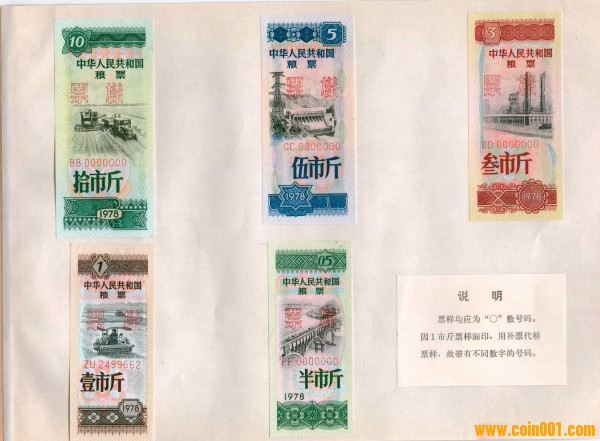 ---"7818"--戰(zhàn)備糧票發(fā)行背景-- 1976 年9月9日毛澤東主席病逝,10月6日黨中央一舉粉碎了"四人幫".一時(shí)國內(nèi)政治.經(jīng)濟(jì).社會(huì)不很平靜;國內(nèi)外各種敵對勢力不斷制造緊張關(guān)系.為防止突發(fā)戰(zhàn)爭,中共中央國務(wù)院決定儲(chǔ)備一定數(shù)量的糧票,于1978年絕密印制了一定數(shù)量的糧票:即中華人民共和國糧票,代號(hào)為"7818"工程.該票5枚一套.糧票印好后儲(chǔ)存在北京,吉林,湖南.江西和陜西等五省市"戰(zhàn)備"倉庫內(nèi). 這套國票采用五角星水印防偽印鈔紙凸版印刷,豎版.票面印有編號(hào),這在糧票中甚為獨(dú)特.票面滿版紋飾,對票的美觀起作烘云托月的效果.票面有鐵紅,吉紅, 正藍(lán),粉紅,中蘭,正綠,湖綠,淺湖綠,米黃,黑色等11種色調(diào).鮮艷精美.這在全國數(shù)萬種糧票中絕無僅有.圖案是農(nóng)業(yè)機(jī)械和水利工程.充分顯現(xiàn)出毛澤東關(guān)于"必須把糧食抓緊"的豐富內(nèi)函.糧票正面上方印有中華人民共和國國徽,顯示共和國糧票的莊重和權(quán)威. 這套糧票始終就沒有發(fā)行.20年后的1997年,在銷毀時(shí),少量"溜入"收藏品市場,收藏者見了,愛不釋手,半斤稀少.10斤特稀!!!這套糧票具有五大特點(diǎn):一是我國首套印有“中華人民共和國糧票”字樣的糧票(其他均為“中華人民共和國糧食部全國通用糧票”)。二是全國糧票中首套(全國糧票只有2套是這樣,82 年也是)枚枚都有水印防偽標(biāo)志的糧票,且這套票是雕刻版的,更增加了防偽性能,水印加雕刻版的全套票在糧票中是極是少見的。三是首次在全國糧票票面上有兩位漢語拼音字母和7位數(shù)的阿拉伯?dāng)?shù)字編號(hào)。四是首次采取豎式印制的全國糧票,也是唯一的一套。五是首套“中國戰(zhàn)備糧票”,并在印制完畢后,一直秘密地儲(chǔ)藏在北京、湖南、山西等地戰(zhàn)備倉庫里,與世隔絕20來年而未使用流通,直至燒毀時(shí)極少量的被偷偷地流了出來,這時(shí)人們方始見該票的廬山面目。 此為78年全國糧票票樣,更為稀少!