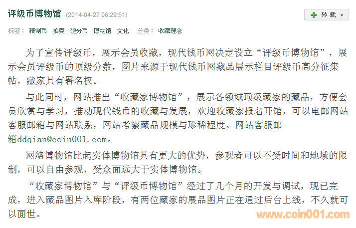 引用 引用樓主大蔥于2014-04-27 07:26發(fā)表的 【評級幣博物館】和【收藏家博物館】 : 現(xiàn)代網即將推出【評級幣博物館】和【收藏家博物館】,轉載與老孫的博文http://blog.sina.com.cn/s/blog_4d95e4780102e3so.html
