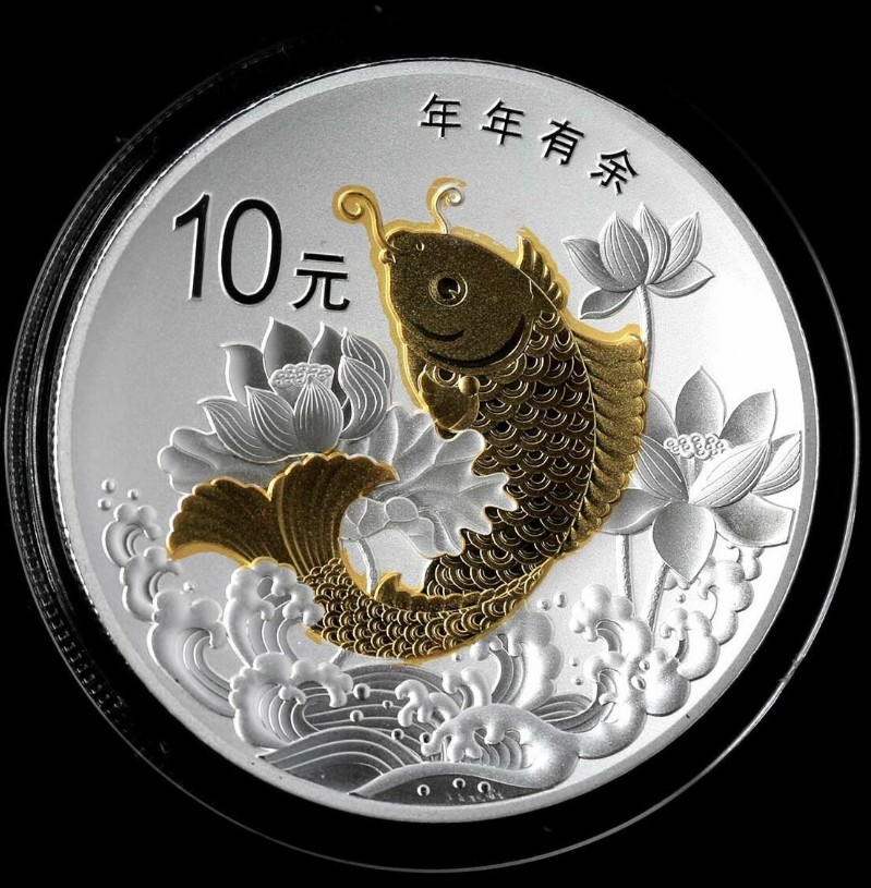 年年有余,是中國傳統(tǒng)吉祥祈福最具代表的語言之一,象征財富與收獲。它是由“年年有魚”的諧音演化而來的,我國民俗歲末祭祖以魚為供品,就是取“年年有余”之意,賦予對來年一份美好的祝愿。以魚為主題衍生的“年年有余”吉祥圖案成了賀歲常見的表現(xiàn)形式,在年畫、刺繡、剪紙等藝術作品中慣用蓮花或蓮藕與鯉魚組合,寄寓“年年有余”、“蓮連有魚”、“家家得利”等吉祥兆頭。金銀幣中的“年年有余”圖案設計依然以傳統(tǒng)文化為準則,沿用蓮花和鯉魚這兩個傳統(tǒng)吉祥元素作為主景圖,保留著其豐富的文化底蘊,給人熟悉而親切的感覺。在立體浮雕的效果下,錦鯉呈騰躍向上之態(tài),活潑,喜慶;蓮花展圣潔孤高之姿,盛大,婀娜,對應著春節(jié)的歡騰氣氛,令人意氣風發(fā),面對來年豪情滿滿。