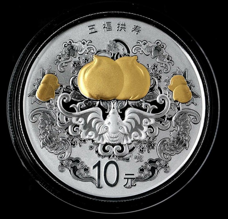 五福拱壽,又稱“五福捧壽”,是民間廣為流傳的一種傳統(tǒng)吉祥圖案,起源于清康熙時期瓷器裝飾中的一種吉祥紋樣,構(gòu)圖常以五只蝙蝠圍著壽字或桃子,寓意多福多壽。蝙蝠在民間被視為吉祥物,以“蝠”喻“?!?,五只蝙蝠即為“五?!保ǜ?、祿、壽、喜、財),是民間喜聞樂見的吉祥符號。金銀幣中的“五福拱壽”圖案設計汲取了傳統(tǒng)元素,但又不拘泥于常見圖式,主圖一只大蝙蝠雙翅如手,捧起兩只壽桃,像虔誠的信徒在朝圣,賀壽送福的意態(tài)盡顯,四只蝙蝠分踞周圍,像是佛陀座下的四大金剛,形似守護神。祥云、壽桃烘托,瑞祥之氣縈繞,吉象橫生,福壽延綿。