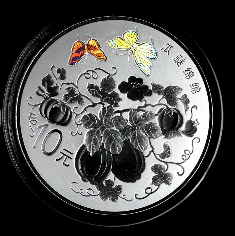 瓜瓞綿綿一詞,源于《詩經(jīng)·大雅·綿》:“綿綿瓜瓞,民之初生,自土沮漆?!睍姹疽鉃樾」鲜忌鷷r雖小,但其蔓不絕,會逐漸長大,綿延滋生。后被引申為祝愿子孫昌盛,興旺發(fā)達,且成為民間一種吉祥圖畫的名稱。金銀幣中的“瓜瓞綿綿”緊緊圍繞“綿”的主題,以枝葉藤蔓瓜連的圖式為意,在藤蔓瓜連中體現(xiàn)了中國傳統(tǒng)的“傳宗接代”觀念,同時在富有朝氣的枝葉中注入了繁榮昌盛的寄愿。一雙彩蝶相依相戲,幸福美滿融入畫境,那是對人間樂享天倫的精彩寫照,“瓜瓞綿綿,爾昌爾熾”,美好生活如此多嬌!