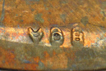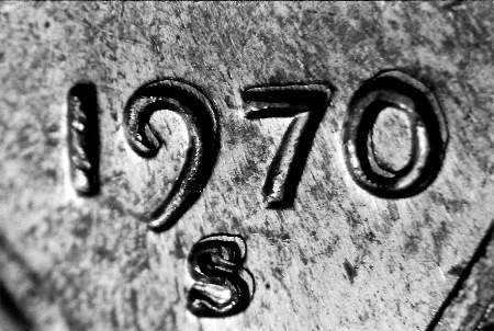 一枚 1969-S 分幣上的日期和廠記同時(shí)出現(xiàn)機(jī)械復(fù)打現(xiàn)象。這種平展、條板狀的重影經(jīng)常與前一幅照片中真正的重?,F(xiàn)象相混淆。廠記上的機(jī)械復(fù)打印記再明顯不過。重模的 1970-S 林肯分幣公認(rèn)只有寥寥幾十枚。但是帶有機(jī)械復(fù)打的 1970-S 林肯分幣卻十分常見。下面是 1970-S 分幣上真正的日期重模的照片,隨后是相同部位機(jī)械復(fù)打的照片。