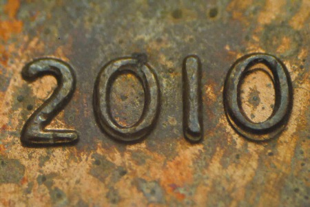 以下照片顯示出 2010 年林肯分幣上的機(jī)械復(fù)打。在 LIBERTY 和日期上,可見到典型的平展、條板狀復(fù)打印記,因?yàn)樗鼈冊(cè)趲琶嫔鲜峭怀龅脑O(shè)計(jì)成分。在設(shè)計(jì)師姓名的首字母上,可以見到明顯的重影,看起來就像重?,F(xiàn)象。但是設(shè)計(jì)師姓名的首字母是凹陷的,因此這也是機(jī)械復(fù)打。