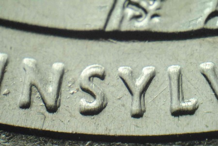 許多現(xiàn)代錢幣,如壯麗美國(America The Beautiful)25美分銀幣,都有凹陷的設(shè)計(jì)成分。在這些25美分硬幣的正面,幣邊附近的字母是凹陷的。當(dāng)這些凹陷的設(shè)計(jì)成分出現(xiàn)重影時(shí),基本上全部都是機(jī)械復(fù)打。以下照片顯示出 2011-P 賓夕法尼亞葛底斯堡25美分硬幣幣邊附近的凹陷字母上發(fā)生的機(jī)械復(fù)打。