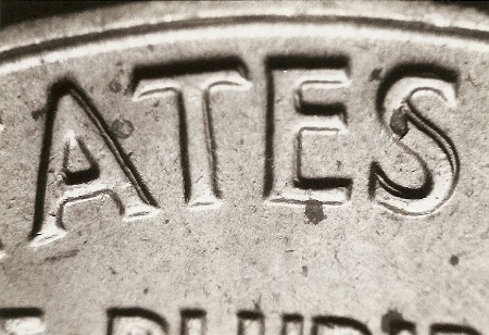 這幅照片里 AMERICA 一詞的字母上的重影是真正的重模現(xiàn)象。這是一枚 1950 精制5分硬幣。