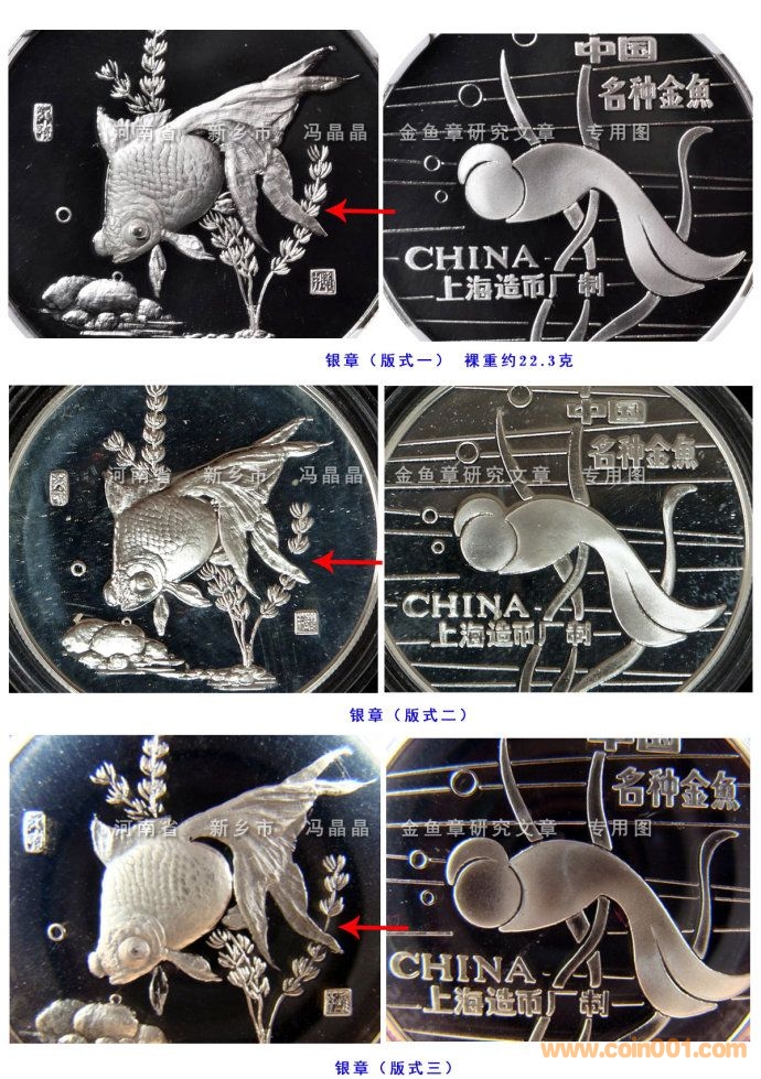 5.金魚鍍銀章,有的是有噴砂和鏡面對比的,但重量明顯比銀章要輕,銀章裸重約22.3克;“先鍍后壓”工藝,上幣開始使用的時間也較晚;
