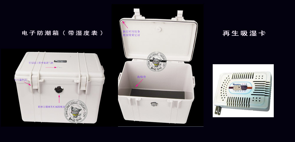 http://s.taobao.com/search?q=%B5%E7%D7%D3%B7%C0%B3%B1%CF%E4&commend=all&sort=price-asc&ssid=s5-e&bcoffset=2&s=80#J_FilterTabBar 防潮箱+電子再生吸濕卡 采用抗沖擊工程塑料一體成型,新型的橡膠密封條,氣密防水,帶可再生吸濕卡和濕度表,濕度表顯示數(shù)值大于60時(shí)取出電子再生吸濕卡 通電1-2小時(shí),紅色硅膠變成紫色即可撥出,放入箱內(nèi)就可吸濕保持干燥。在實(shí)際使用中,建議每次封箱前用家用電吹筒將箱內(nèi)冷濕空氣吹走,這樣每次吸濕卡可以持久一點(diǎn)。
