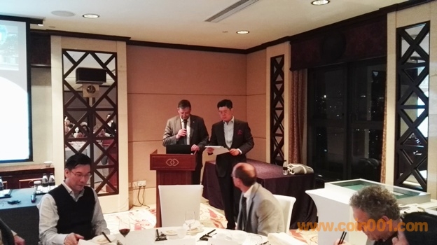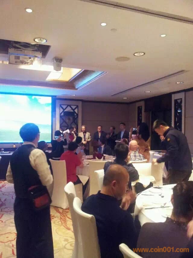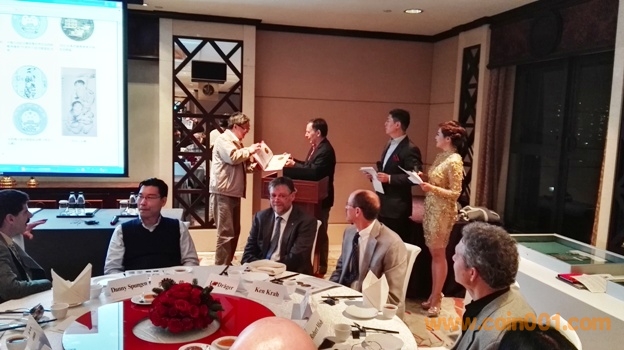 晚宴的主題是尼克布朗年度人物頒獎(jiǎng)儀式, 100余位國(guó)內(nèi)外的知名錢幣專家和錢幣公司一起參與其中,我和孫老師座一桌,同桌還有愛秀集團(tuán)總裁周麥可先生,美國(guó)貓王Peter ,擁有幣王奉天一兩的收藏家周大為,上幣設(shè)計(jì)師趙檣,南京造幣廠設(shè)計(jì)師張琛琛,上幣博物館前館長(zhǎng)張耀群等,其他桌的我基本都不認(rèn)識(shí)。頒獎(jiǎng)儀式的氣氛非常熱烈。尤其值得驕傲的是上海造幣廠雕刻師余敏先生獲得2015年度尼克布朗人物獎(jiǎng),南京造幣廠張琛琛女士和上海造幣廠董慧珍女士獲得了收藏貢獻(xiàn)獎(jiǎng),3位造幣廠專家的獲獎(jiǎng)表明中國(guó)錢幣的設(shè)計(jì)在不斷的進(jìn)步。晚宴中有多位海外資深藏家發(fā)言探討錢幣收藏的心得,頒獎(jiǎng)儀式全程由陳景林先生擔(dān)任翻譯,廣東電視臺(tái)的主持人擔(dān)任會(huì)議主持工作。