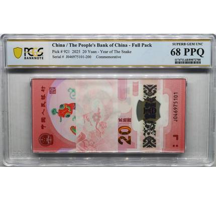 2025年蛇鈔標百J046975101-200 PCGS 67PPQ,高位單4,亂蛇號6張【祝大家新年快樂,本次專場周二結(jié)拍,預(yù)計周四發(fā)貨,周四發(fā)貨,周四發(fā)貨!介意勿拍!】請各位朋友仔細看下運費規(guī)則:1.默認付18元發(fā)順豐陸運,送500元保價2.付10元發(fā)申通快遞,運輸速度會慢一點3.順豐到付:陸運不保價,首重18元起4.多單合郵,中介合郵可加我微信退運費