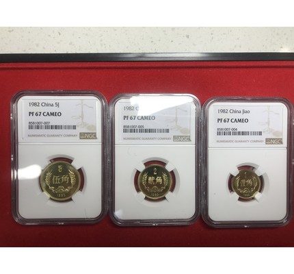 1982年精制角幣一套三枚 NGCPF67CA,噴砂好,同一串號(hào)配套不易拍賣注意事項(xiàng)(出價(jià)參拍前務(wù)必看一下):1,評(píng)級(jí)幣分?jǐn)?shù)以評(píng)級(jí)公司專業(yè)的評(píng)判為準(zhǔn),原則上售出非假不退!出價(jià)表示對(duì)評(píng)級(jí)公司以及分?jǐn)?shù)的認(rèn)可,出價(jià)無悔,請(qǐng)謹(jǐn)慎出價(jià)!2,對(duì)評(píng)級(jí)幣的品質(zhì)和評(píng)級(jí)幣盒子外觀(包括但不限于如鼓盒,劃痕,污漬,磨損,磕碰等)有苛刻要求的請(qǐng)出價(jià)前提前咨詢!!對(duì)拍品節(jié)拍后的咨詢不作解釋,出價(jià)前請(qǐng)仔細(xì)觀察,慎重出價(jià)!3,結(jié)拍后順延3-5天都是在發(fā)貨中(請(qǐng)盡量48小時(shí)內(nèi)付款),快遞一律順豐!江浙滬12元,安徽14元,常規(guī)區(qū)域按標(biāo)價(jià)18元(西藏,新疆,海南25元)!中拍多單合并僅收一次!單個(gè)快遞高價(jià)值的建議發(fā)空運(yùn)和保價(jià)。4,多單中拍且走網(wǎng)站中介的,請(qǐng)微我修改運(yùn)費(fèi);沒有及時(shí)修改的也可在確認(rèn)收貨后微我退運(yùn)費(fèi)!!5,任何疑問,如有需要拍品視頻、咨詢錢幣品相問題,咨詢錢幣外包裝配件是否齊全,外包裝劃痕鼓盒等問題請(qǐng)出價(jià)前咨詢!在節(jié)拍前提前咨詢!結(jié)拍后請(qǐng)勿索要任何照片或者視頻,也請(qǐng)勿再咨詢?nèi)魏闻钠穾呕蛘邭ぷ拥南嚓P(guān)問題?。?!節(jié)拍后不以以上問題退貨?。?6,嚴(yán)禁棄拍!行情漲跌風(fēng)險(xiǎn)、再評(píng)級(jí)風(fēng)險(xiǎn)(再評(píng)級(jí)是否貼的上標(biāo))等等不可控因素需自行承擔(dān)。望大家理智出價(jià)、因需出價(jià)。否則將進(jìn)行投訴!謝謝配合!7、非評(píng)級(jí)幣拍品,如裸幣或者一些第三方封裝的拍品(可取出或者不可取出的),請(qǐng)以圖片或者視頻為準(zhǔn),有疑惑拿不準(zhǔn)的請(qǐng)?zhí)崆白稍兤废?,不以到手后跟預(yù)期有差距等情況為理由退貨。8、本拍品的描述為客觀描述,請(qǐng)結(jié)合自己的眼力和能力進(jìn)行判斷(如養(yǎng)護(hù)和無養(yǎng)護(hù),真彩或者假彩,都請(qǐng)自行判斷),不以拍品描述為理由進(jìn)行退款退貨退出價(jià),請(qǐng)理智出價(jià),看準(zhǔn)后出價(jià)!