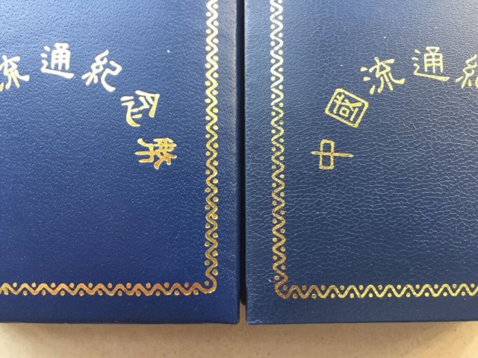 最近筆者對包裝進一步觀察,發(fā)現(xiàn)我的藍盒子還分兩種,存在細微差別。一種是盒子表面文理為點狀(第一圖左),打開盒子,內(nèi)口鑲嵌白色條狀織物,拐角為直角(第二圖左);另一種盒子表面文理為條紋狀(第一圖右),打開盒子,內(nèi)口鑲嵌白色條狀人造板,拐角為圓角(第二圖右)。我的兩張朱德證書也存在差別(上為第一種,下為第二種)。